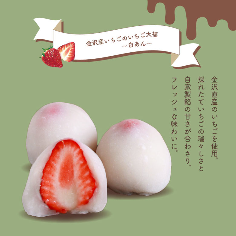 地元金沢の滝本農園様の直産フレッシュいちごと自家製餡を使ったジューシーないちご大福。