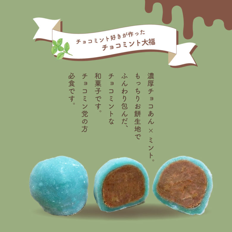 濃厚チョコあん×ミントのもっちりお餅生地で包んだ大福です。