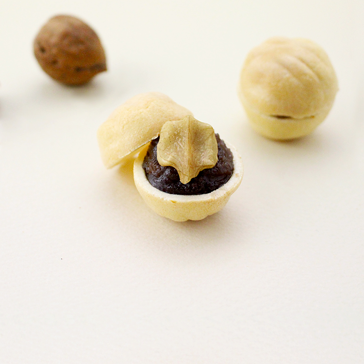ころんと丸いフォルムの中に大粒のくるみが丸ごと入った贅沢な和菓子。